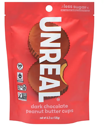 UNREAL reimagines your favorite classic treats, from peanut butter cups and coconut-filled chocolates to colorful, bite-sized gems. Most dark chocolate varieties from UNREAL are certified vegan and are often made with less sugar than traditional chocolate candies.