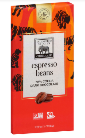 Endangered Species Chocolate is on a mission to donate 10% of net profits to impactful organizations involved with conservation efforts like the African Wildlife Foundation. Their bars are made with simple ingredients and their espresso bar is made with roasted ground coffee for a slight caffeine boost.